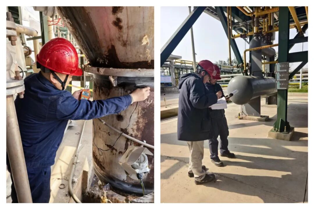 此次检验期间的寒冷天气和复杂环境给户外检验工作带来诸多挑战。检验人员需穿着厚重的防寒服,在空间狭窄、环境复杂的检测点位上手持专业检测仪器,爬高塔、钻容器、查管线。他们始终秉持专业严谨的工作态度,认真负责地检测每一台设备,针对发现的潜在隐患,及时与企业技术人员沟通对接,提出整改建议,为设备安全运行提供有力的技术支撑。