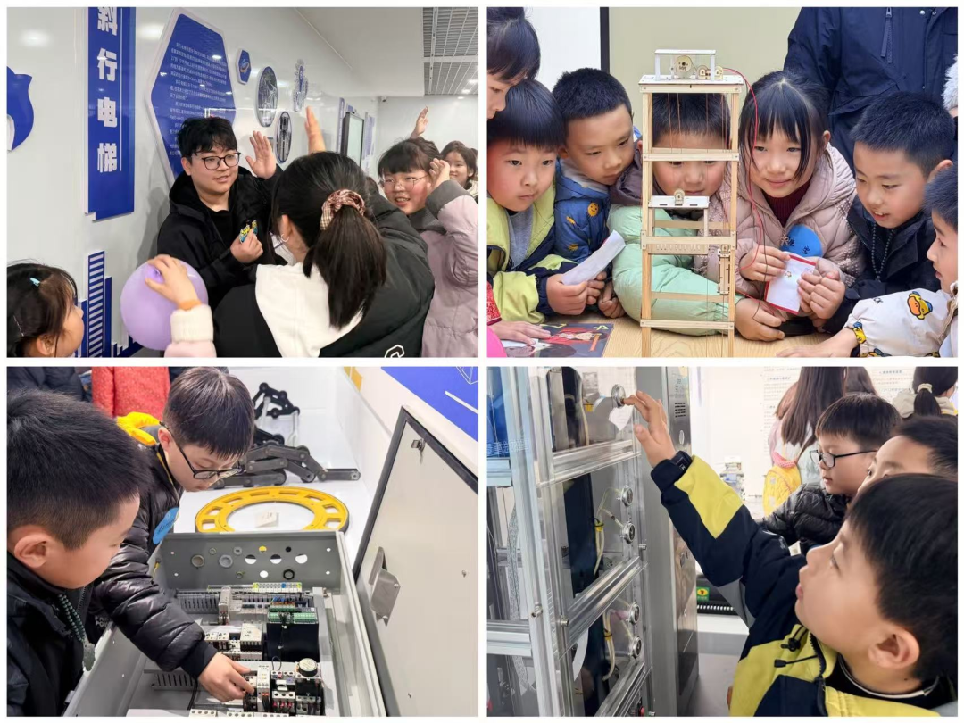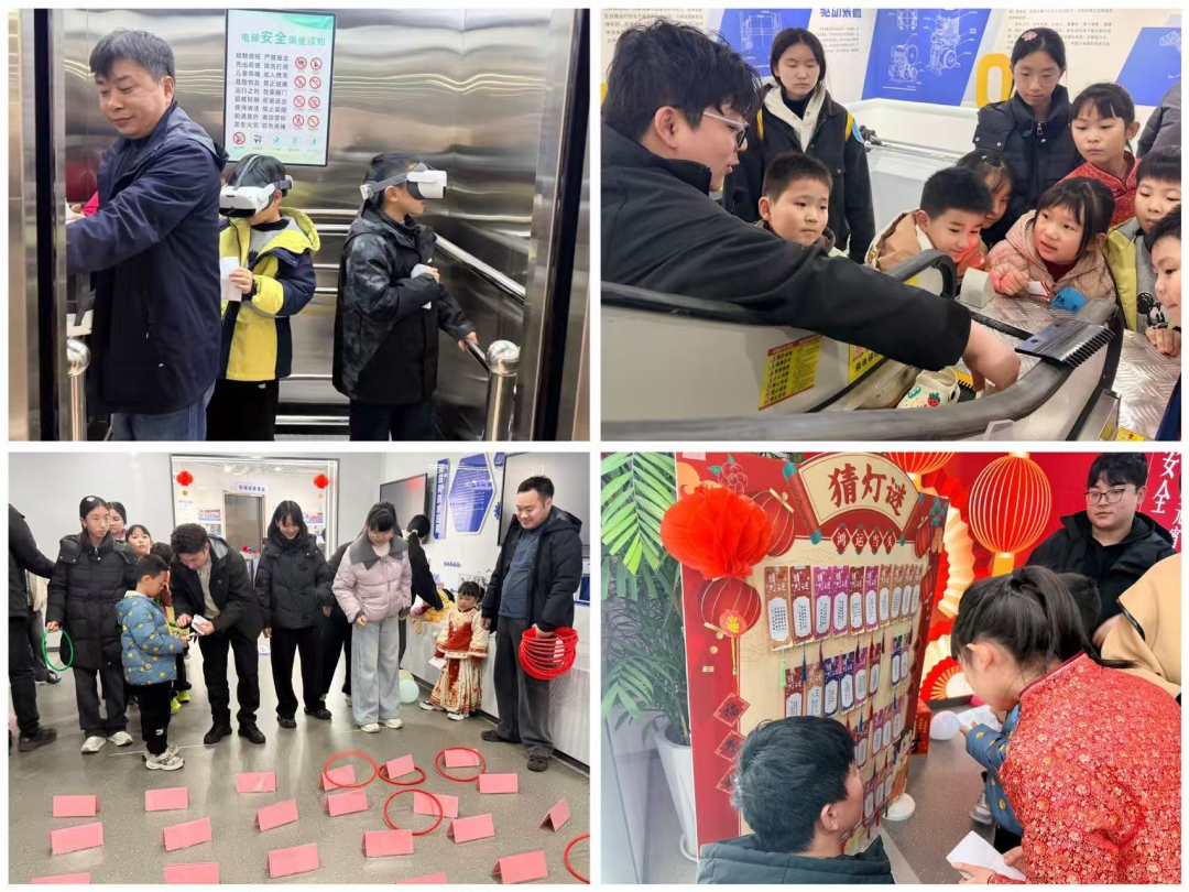 活动以“积分打卡”为主线,精心设置了科普参观、互动游戏、灯谜竞猜三个环节。孩子们在讲解员的引导下,依次参观了电梯主要零部件、整机模型、事故警示、手工体验等九大展区,借助VR设备沉浸式体验电梯故障与应急处置场景。每个展区还穿插了随机问答环节,让孩子们在探索中及时巩固安全知识,真正实现寓教于乐、学有所获。